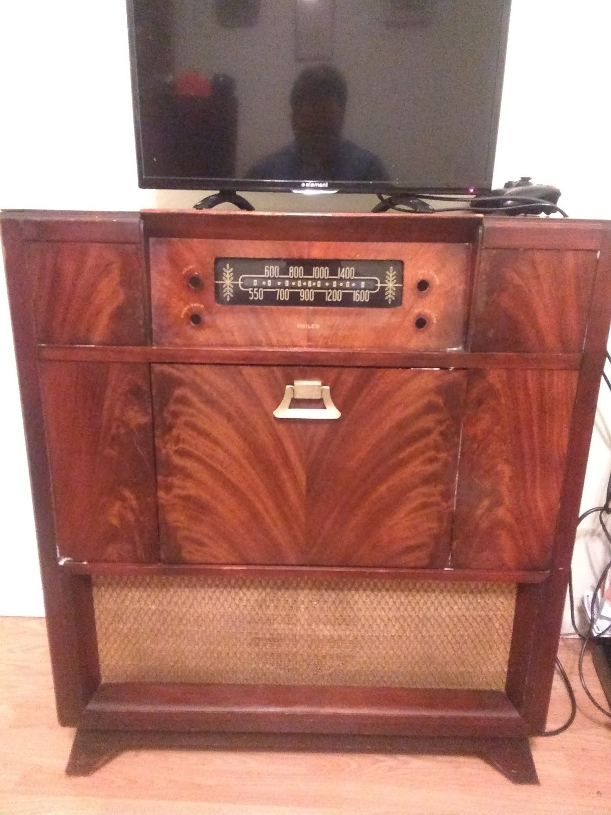 They were planning to throw it out if it didn't sell in two days. So, I bought it for $8, removed the radio chassis, replaced the 1960s replacement record player with a Crosley unit that has Bluetooth! It's apparently a rare console; about 4,500 were made in 1948.